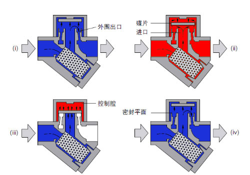 在啟動階段,由于壓力的作用,碟片被頂起,冷凝水和空氣越過內(nèi)側(cè)閥座經(jīng)碟片下部從外圍出口的三個小孔排出(見圖i)。高溫的冷凝水經(jīng)過入口,進(jìn)入到閥腔碟片的下部后壓力下降,產(chǎn)生閃蒸蒸汽并以高速流動。由于速度升高,所以碟片下壓力降低,把碟片拉向閥座(見圖ii)。同時一部分閃蒸蒸汽進(jìn)入到碟片上面的腔體內(nèi),產(chǎn)生的壓力克服冷凝水向上的壓力把碟片壓在內(nèi)外側(cè)閥座上,此時閃蒸蒸汽被封存在碟片的上部,碟片上面的壓力和下面的壓力相平衡,但因為上面的作用面積比較大,作用在碟片上面的力要大于碟片下面的力。最后,當(dāng)?shù)喜壳惑w內(nèi)的閃蒸蒸汽冷凝后,在下部冷凝水的壓力下碟片被頂開此重復(fù)循環(huán)。